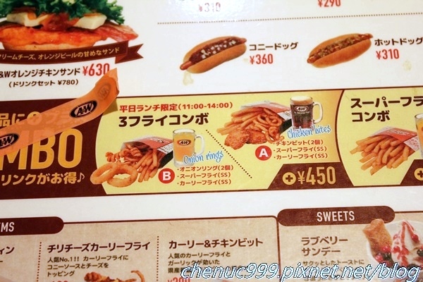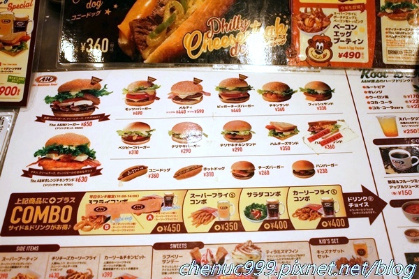 A&W以一個最便宜的漢堡 230円(牛肉堡),飲料+薯條需要另外加價購 350円起,所以一套漢堡全餐吃下來約 580円左右,相當於台幣 160元。