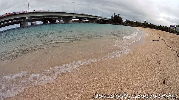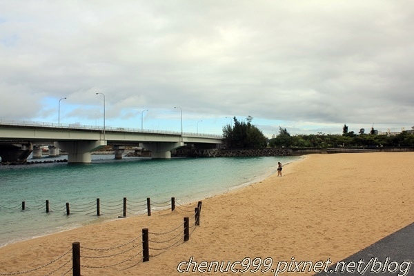 停車區旁下去就是波上海灘,同樣屬於貝殼沙,小小的,前方還有條橋(?),視野雖然不及古宇利海灘來得廣闊,但離那霸巿中心很近,難怪夏日總有這麼多人喜歡來玩。