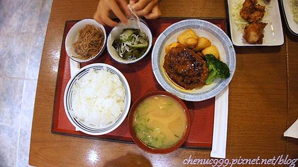 我們取了牛蒡佃煮、醋漬小魚海帶芽、漢堡排佐馬鈴薯,搭配白飯與味噌湯。