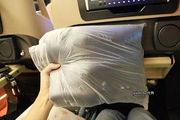 我給所有人都準備了毛毯,毛毯的分裝袋就可以放在頭上的置物箱裡。