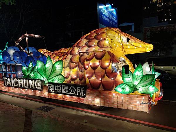 花車遊行隊伍,由穿山甲車打頭陣。這是隻會頭會擺動的穿山甲唷。