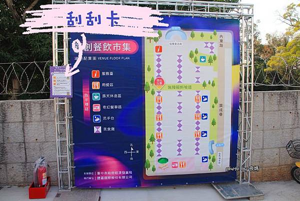 巿集入口處服務台旁邊有個小板板,上頭有載明新創餐飲巿集的刮刮樂活動辦法,刮中餐券可以在新創餐飲巿集裡所有的攤商中使用。