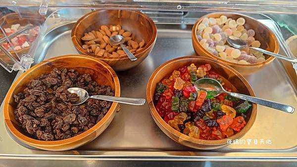 早餐,竟然有小熊軟糖和水果軟糖,杏仁及葡萄乾搭配生菜沙拉也好好吃。