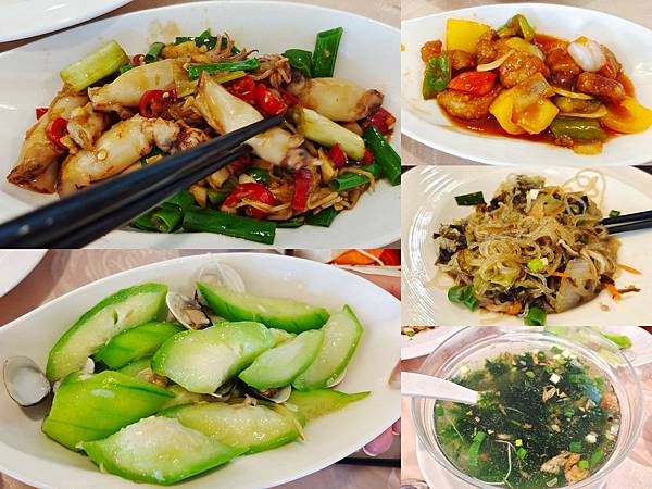 蔥爆小卷、絲瓜蛤蜊、糖醋咕咾肉、海菜各粉及海菜湯,一套雙人合菜 499元。